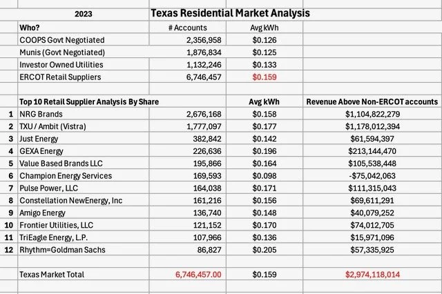 The Texas market has many suppliers yet two firms — NRG and Vistra — own 66% of the accounts making the competitive claim dubious.